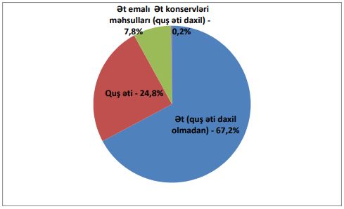 DSK-nın məlumatına görə, 2016-cı ildə ölkəmizdə ət və ət məhsullarının (balıq və balıq məhsulları, diri kənd təsərrüfatı heyvanlarının satışı nəzərə alınmadan) pərakəndə ticarət dövriyyəsinin ümumi həcmi 2.2 mlrd. manat olub ki, bunun da 1.5 mlrd. manatı (67.2 %-i) ətin (quş əti daxil olmadan), 554.4 milyon manatı (24.8 %-i) quş ətinin, 173.3 milyon manatı (7.8 %-i) isə ət məhsullarının (kolbasa və kolbasa məmulatları və s.) payına düşüb.